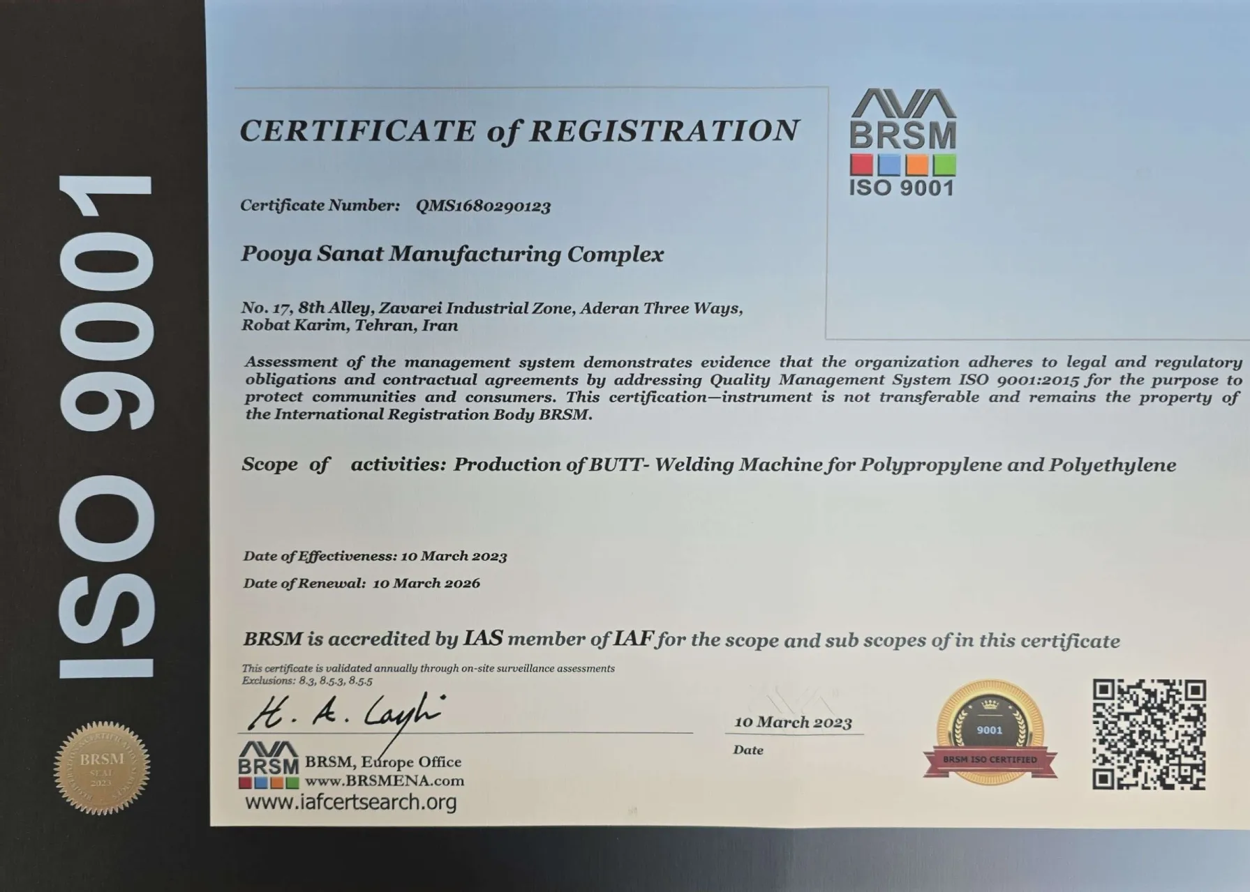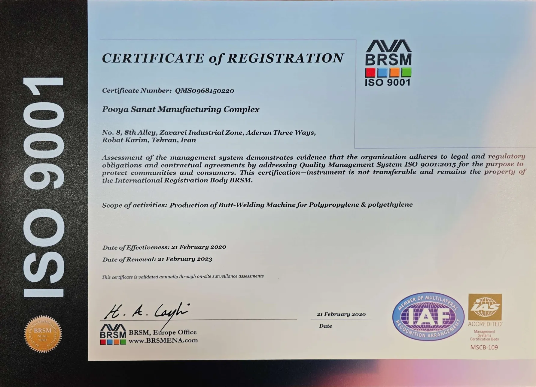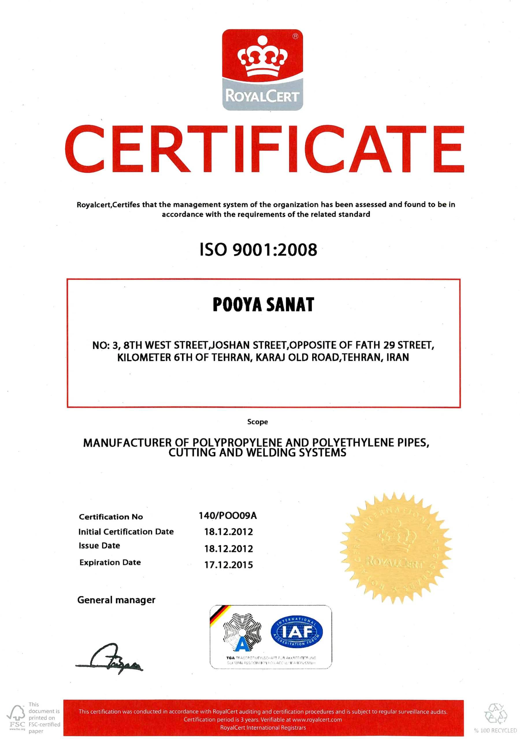 • گواهینامه بینالمللی ISO 9001:2008 – تضمین سیستم مدیریت کیفیت در تمام فرآیندهای تولید و خدمات